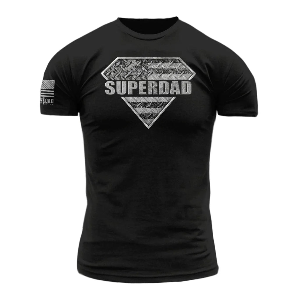 Liberty Load brings you the "Superdad" Tee—a rugged tribute to the men who carry the weight of the world without a single complaint. Featuring a heavy-duty, industrial diamond-plate steel shield forged with the American flag, this shirt is built specifically for the patriarch of the house. Printed on premium, heavy-duty black cotton, it’s a wearable badge of honor for the guy who is always there when you need him.