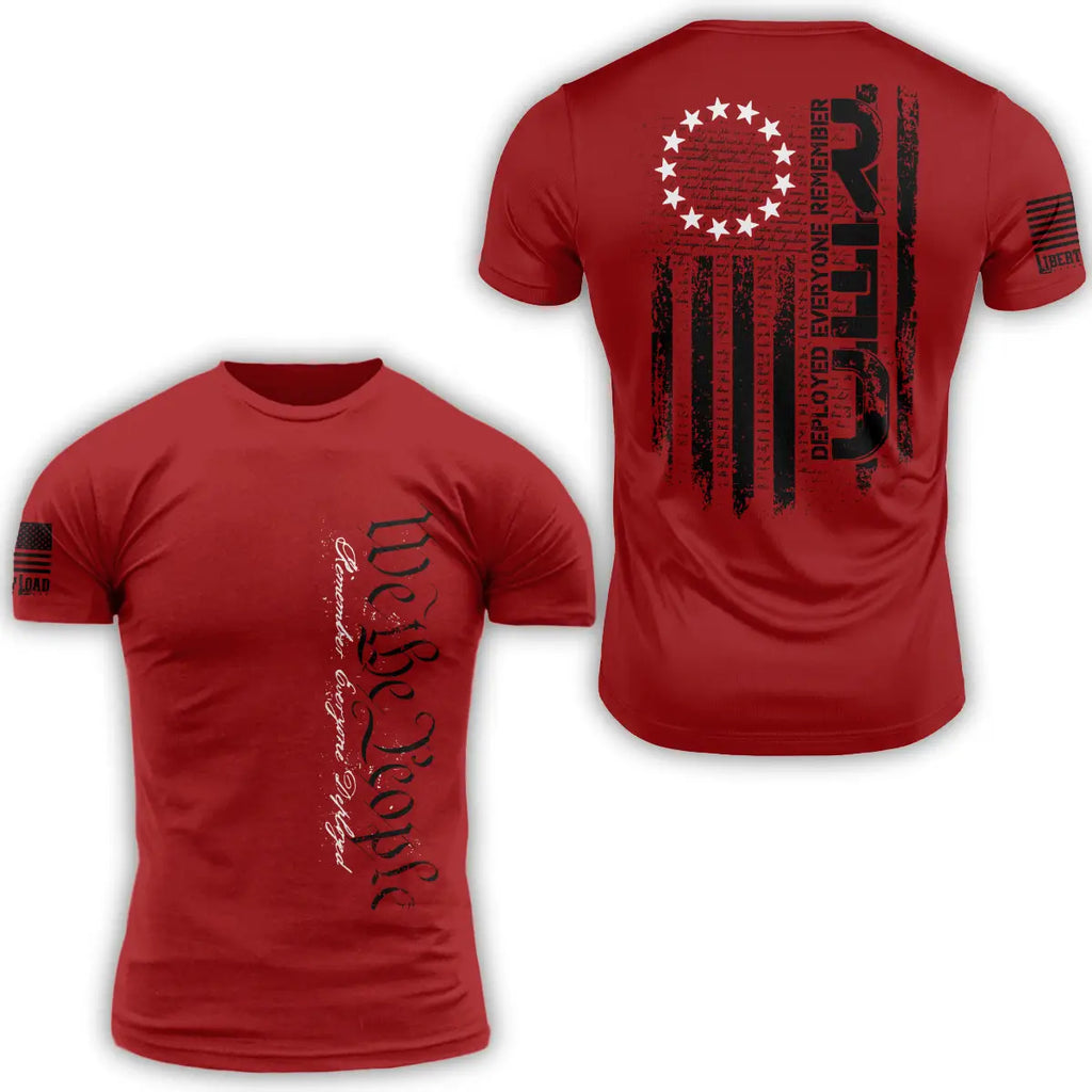 Liberty Load presents the "We the People R.E.D." Tee. Featuring a bold, vertical "Remember Everyone Deployed" graphic woven directly into a distressed, constitutional 13-star American flag, this crimson shirt is the ultimate Friday uniform. Printed on premium, heavy-duty fabric, it’s a powerful, wearable reminder of the unbreakable bond between our founding principles and the troops who swear an oath to defend them.